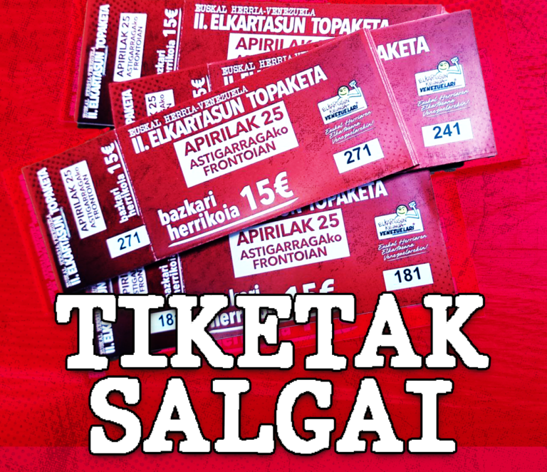 Astigarragako frontoian Apirilak 25eko Euskal Herria-Venezuela II. Elkartasun Topaketan egingo den bazkarirako tiketak salgai. Tiketak erosteko: Astigarraga: Zipotza Hernani: Garin …