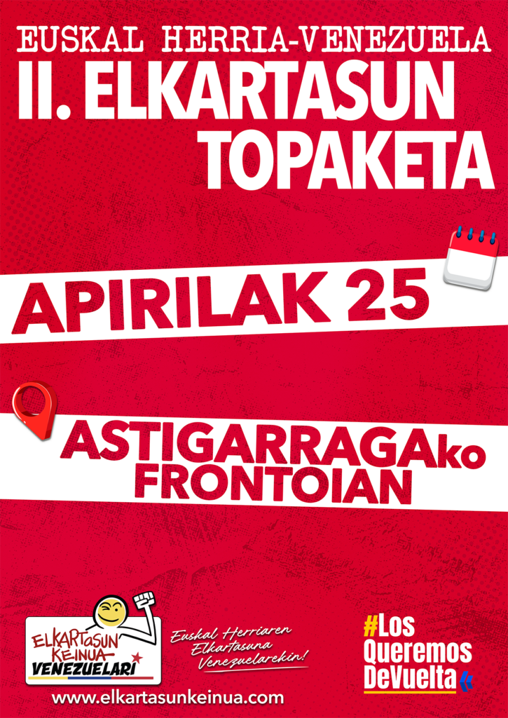 Apirilaren 25ean Euskal Herria-Venezuela Elkartasun Topaketaren bigarren edizioa ospatuko dugu Astigarragan (Gipuzkoa).